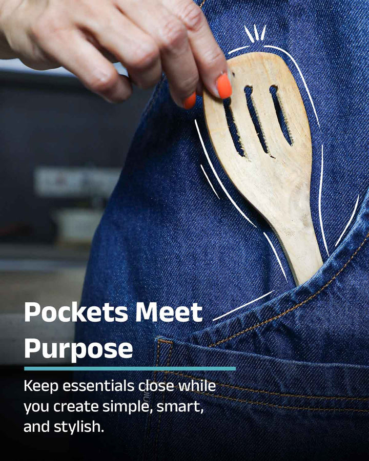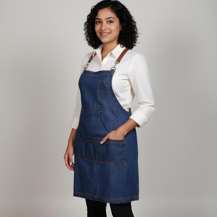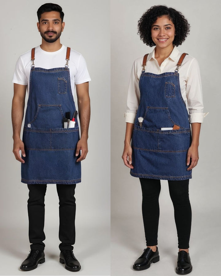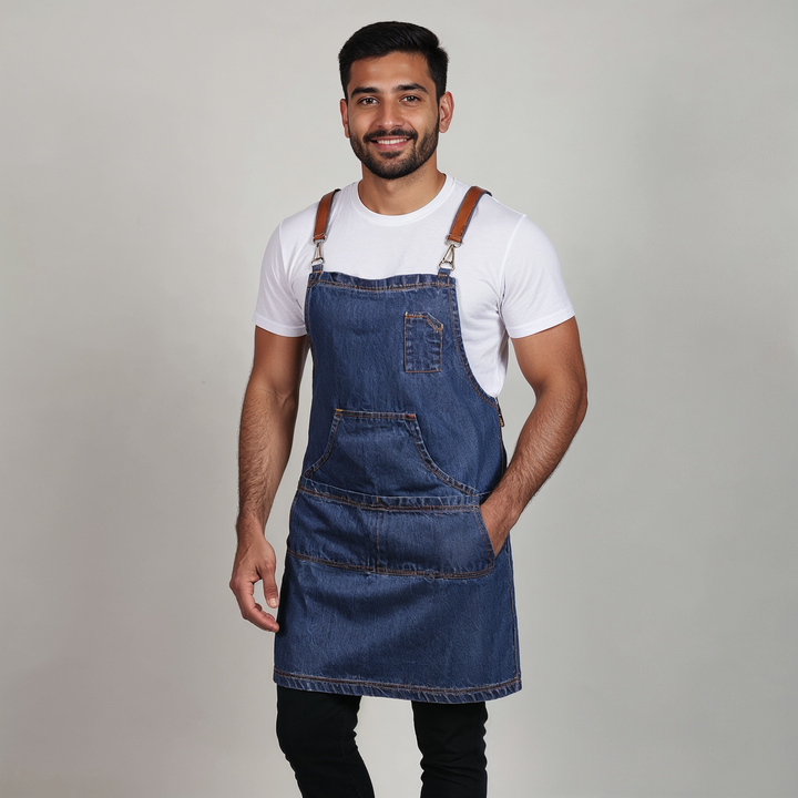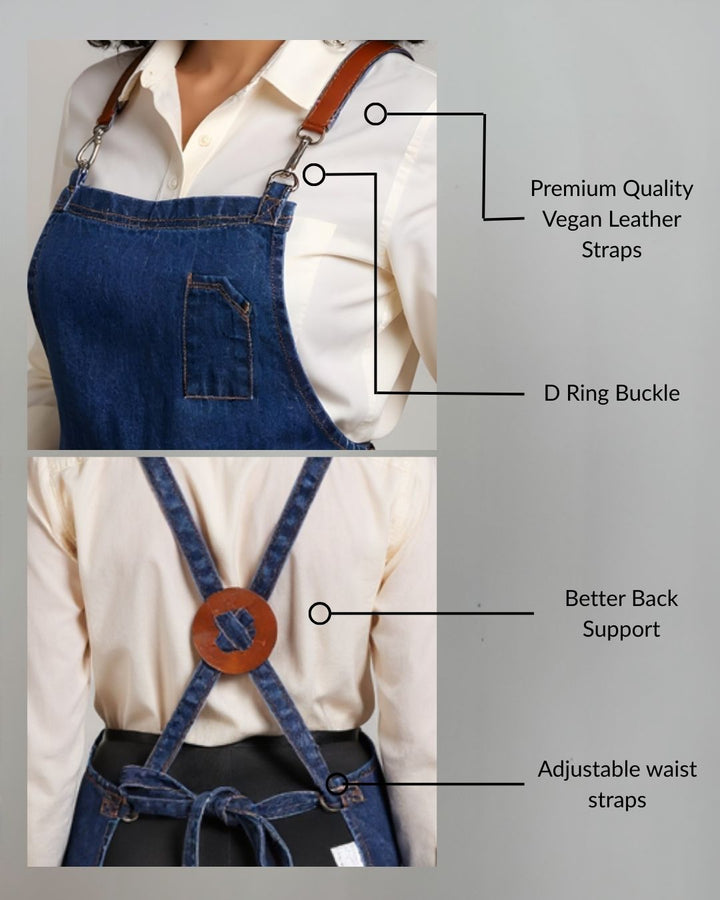 Upgrade your Style quotient at Home or at work with our premium cotton denim aprons! This apron, has an adjustable neck strap secured by a metal buckle and ties around the waist.It has a large kangaroo pocket, perfect for conveniently storing various items and essentials....Read more