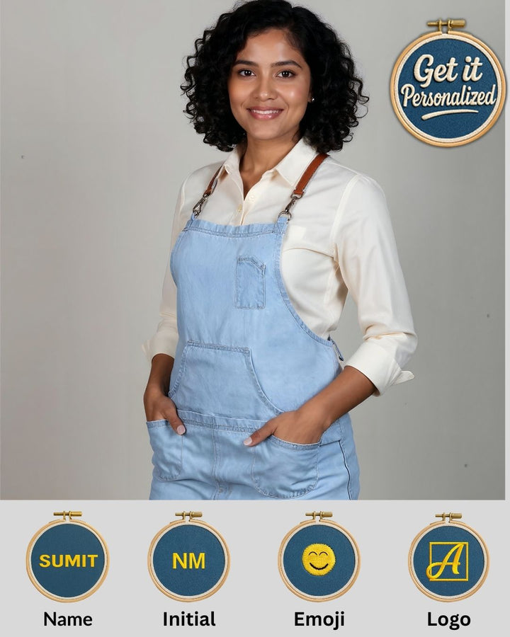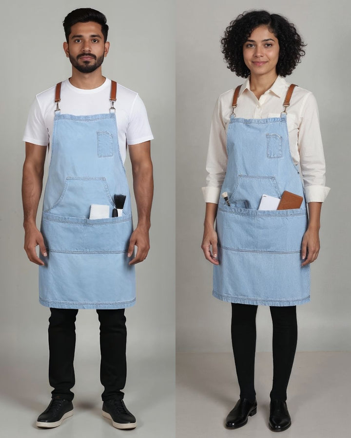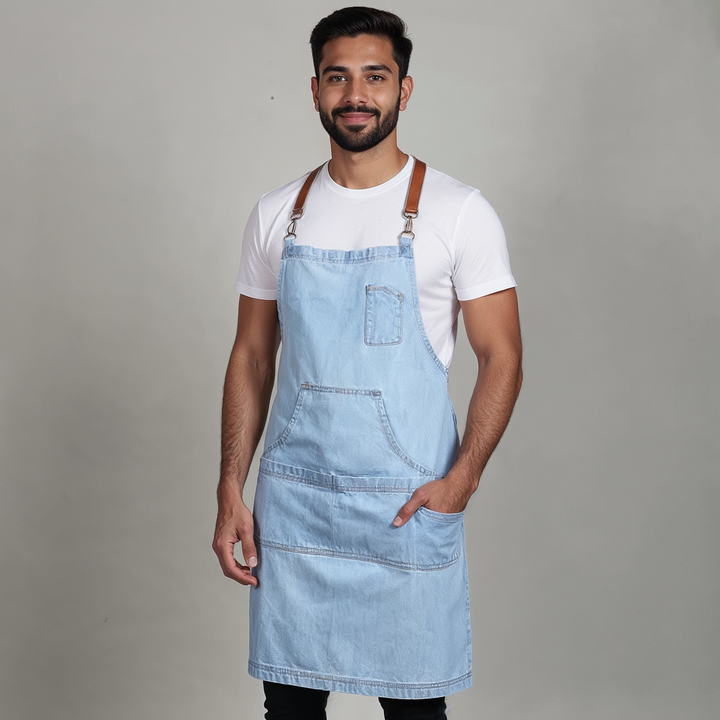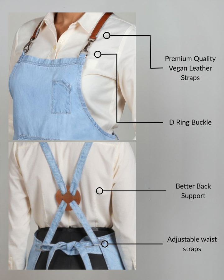 Upgrade your Style quotient at Home or at work with our premium cotton denim aprons! This apron, has an adjustable neck strap secured by a metal buckle and ties around the waist.It has a large kangaroo pocket, perfect for conveniently storing various items and essentials....Read more