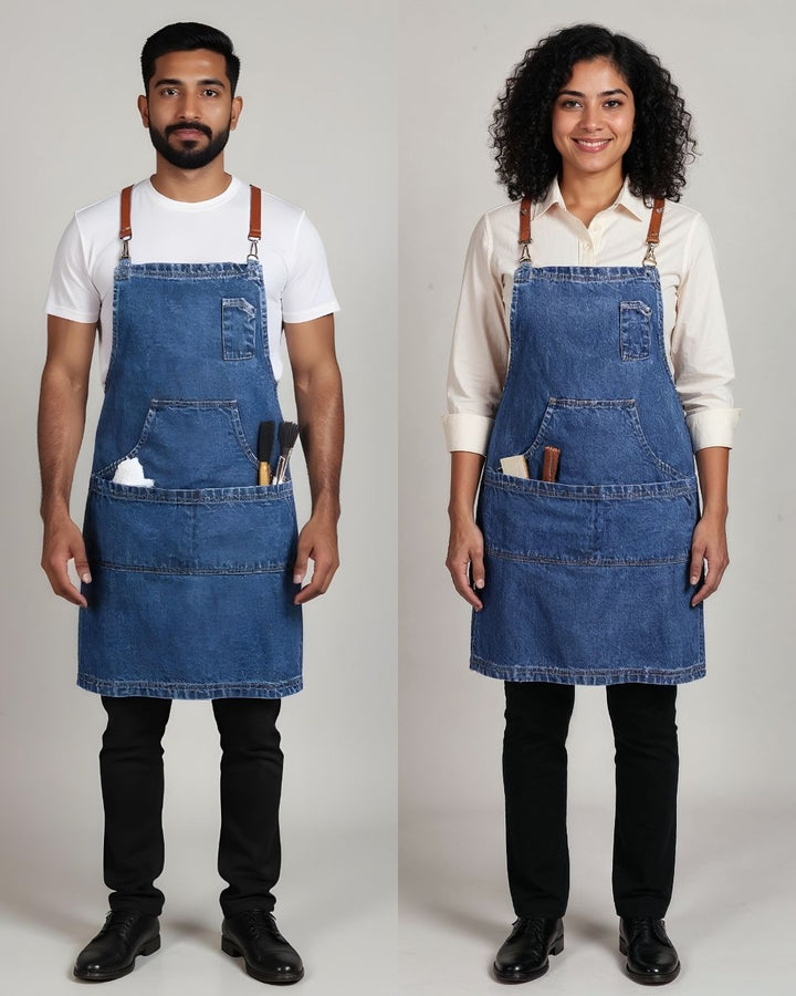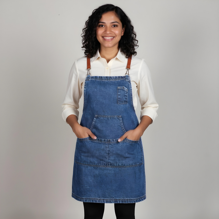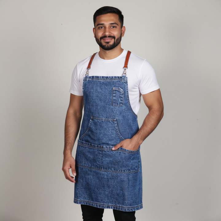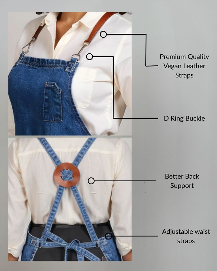 Upgrade your Style quotient at Home or at work with our premium cotton denim aprons! This apron, has an adjustable neck strap secured by a metal buckle and ties around the waist.It has a large kangaroo pocket, perfect for conveniently storing various items and essentials....Read more